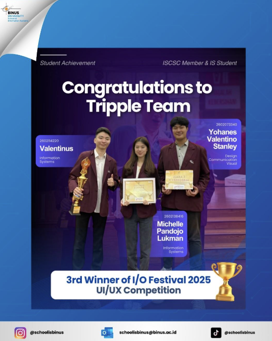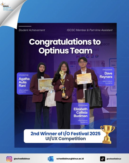 13 Juni 2025 – Selamat kepada Tim Optinus yang beranggotakan Agatha Aulia Rani, Elizabeth Callista Budiman dan Dave Reynara berhasil menjadi Juara 2 pada lomba I/O Festival 2025 dalam cabang UI/UX Competition. Selanjutnya selamat kepada Tim TRIPPLE yang beranggotakan Valentinus, Michelle Pandojo Lukman dan Yohanes Valentino Stanley menjadi Juara 3 pada lomba I/O Festival 2025 dalam cabang UI/UX Competition.