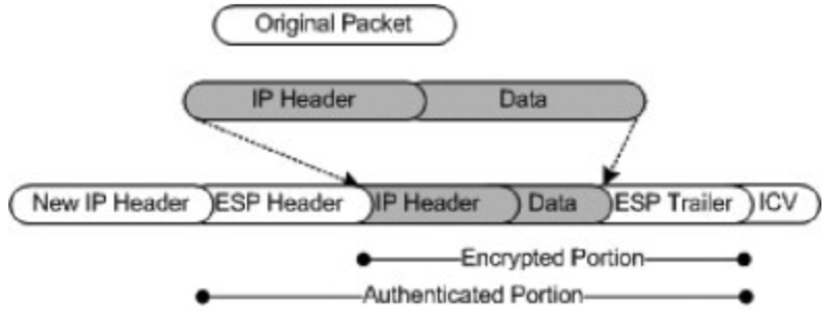 Meskipun mode transport digunakan, dalam hal ini hanya payload yang dienkripsi, ESP mengenkripsi header IP dan payload untuk setiap paket. Setiap paket data memiliki header dan trailer yang ditambahkan oleh ESP.