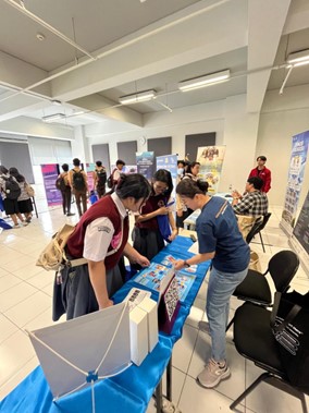 Salah satu booth interaktif yang menarik adalah booth yang menggunakan alat edukatif Makey-Makey, di mana peserta dapat mencoba langsung bagaimana teknologi sederhana dapat digunakan untuk membangun sistem interaktif. Di booth ini juga dijelaskan bagaimana pembelajaran di Sistem Informasi tidak hanya berfokus pada coding, tetapi juga pada pemecahan masalah, analisis kebutuhan, dan pengembangan solusi berbasis teknologi. Sebagai bagian dari edukasi, peserta diajak bermain dengan kartu proses bertajuk Be The Problem Solver with Technology. Kartu ini berisi alur proses pembelian barang di online shop, lengkap dengan berbagai skenario bug yang sering terjadi, seperti barang yang masih bisa dipesan padahal stok sudah habis, atau kurir yang kesulitan menemukan alamat pengiriman. Dari situ, peserta diajak untuk berpikir bagaimana solusi teknologi seperti sistem real-time atau pemetaan digital seperti QMaps dapat digunakan untuk mengatasi masalah tersebut secara efektif dan efisien.