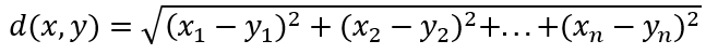 Euclidean distance adalah ukuran jarak “lurus” antara dua titik dalam ruang berdimensi n. Secara matematis, Euclidean distance antara dua titik x=(x1,x2,…,xn) dan y=(y1,y2,…,yn) dinyatakan sebagai: