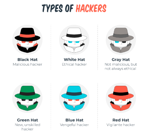 Di masa lampau, komunitas keamanan menggunakan referensi warna topi untuk mengidentifikasi berbagai jenis peretas. Namun, saat ini, beberapa istilah ini telah diganti sebagai bentuk responsi terhadap perubahan budaya. Jenis-jenis peretas yang ada antara lain: