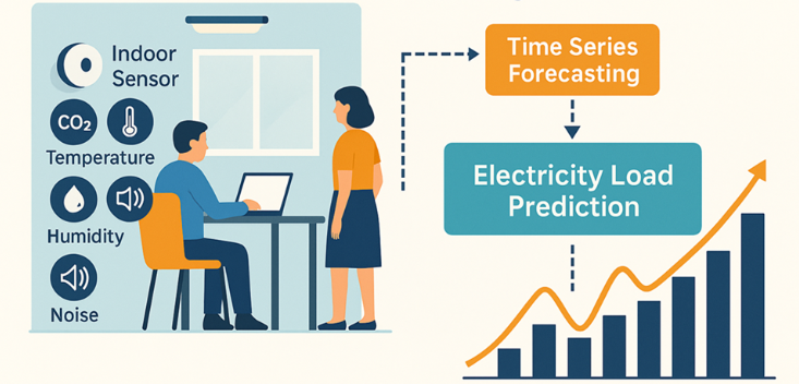 Gambar 1. Ilustrasi cara gedung pintar memanfaatkan sensor lingkungan dan prediksi deret waktu untuk mengatur beban listrik secara efisien. Gambar ini dihasilkan oleh OpenAI ChatGPT.
