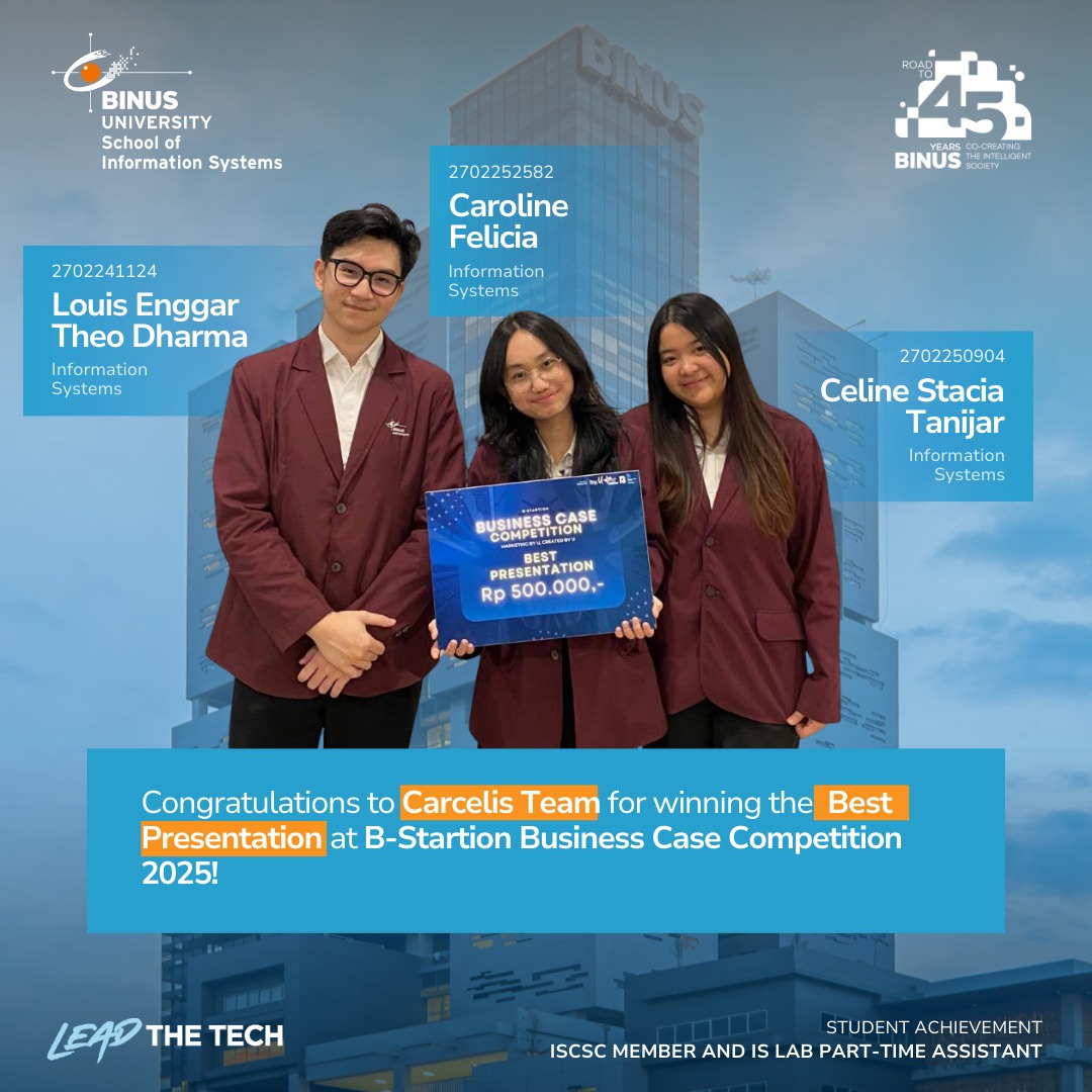 14 Agustus 2025 – Sebuah prestasi membanggakan kembali diraih oleh mahasiswa School of Information Systems, BINUS University. Tim Carcelis yang beranggotakan Louis Enggar Theo Dharma, Caroline Felicia, dan Celine Stacia Tanijar berhasil meraih penghargaan Best Presentation dalam ajang B-Startion Business Case Competition 2025 yang diselenggarakan oleh B-Preneur, Universitas Bina Nusantara.