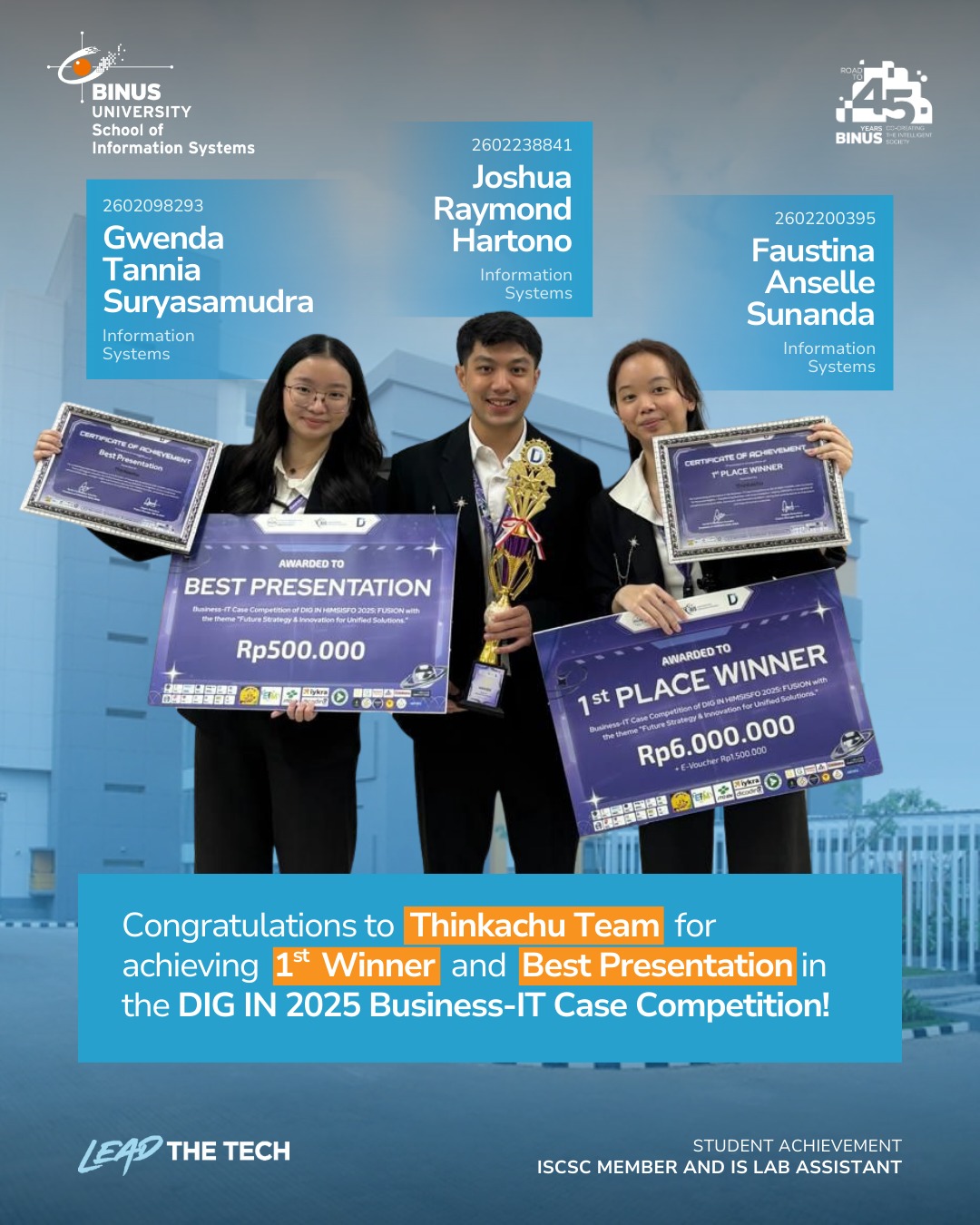 31 Januari 2026 – Selamat kepada Gwenda Tannia Suryasamudra, Joshua Raymond Hartono & Faustina Anselle Sunanda dari tim Thinkachu yang berhasil menjadi 1st Winner and Best Presentation of DIG IN Competition 2025 dalam kategori lomba Business-IT Case Competition yang diadakan oleh Himsisfo BINUS University.