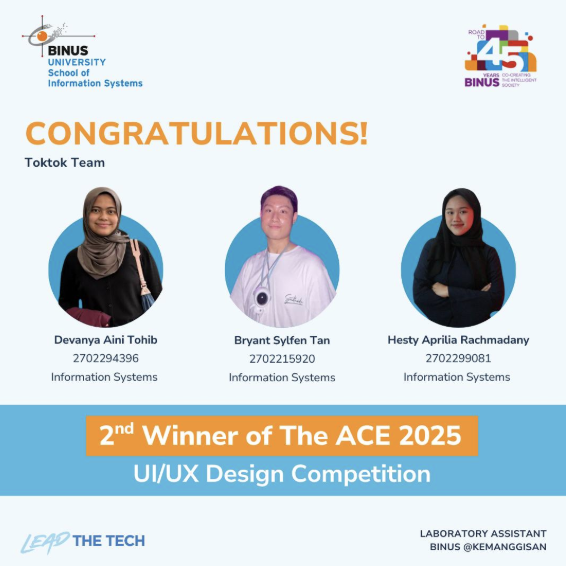 31 Agustus 2025 – Mahasiswa School of Information Systems BINUS University kembali mencatat prestasi gemilang. Tim Toktok, yang beranggotakan Devanya Aini Tohib, Bryant Sylfen Tan, dan Hesty Aprilia Rachmadany berhasil meraih Juara 2 dalam lomba The ACE 2025, sebuah kompetisi desain UI/UX yang diselenggarakan oleh Jurusan Teknik Komputer Universitas Diponegoro.